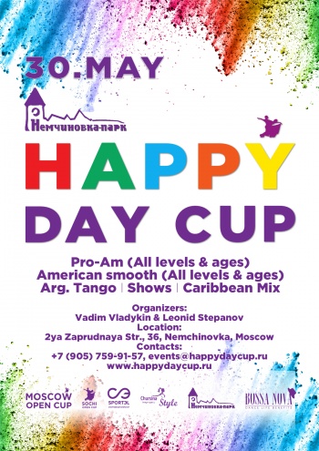 В предверии начала летних каникул, теплых и ярких солнечных дней приглашаем вас разделить с нами счастливые минуты танца в праздничной атмосфере турнира HAPPY DAY CUP 2021, который пройдет 30 мая 2021 года в шикарном праздничном зале Chateau Hotel “Nemchinovka park”, г. Москва. Традиционно вас ожидает высокопрофессиональная судейская коллегия.