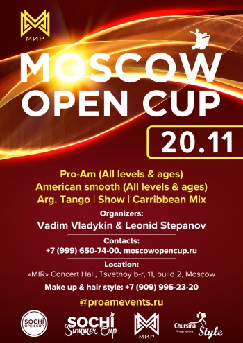 Приглашаем Вас на чудесный турнир Moscow Open Cup – 2021, который состоится 20 ноября 2021 г в Концертном Зале “МИР” по адресу Цветной бульвар, 11 стр. 2, от Вадима Владыкина и Леонида Степанова, профессионалов с многолетним опытом в сфере танцевального спорта, организаторов полюбившегося всем конкурса Sochi Open Cup.