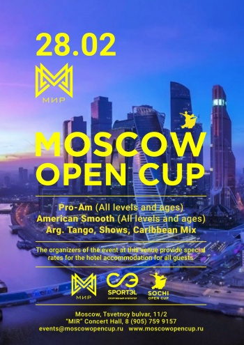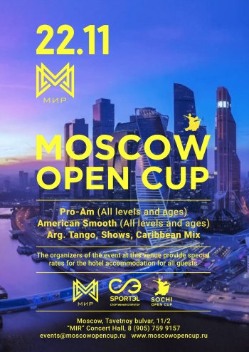 Команда организаторов «SOCHI OPEN CUP» решила привезти для Вас в Москву тёплую сочинскую атмосферу, шикарную живую музыку, свет магических софитов и лучший судейский состав. Приглашаем Вас принять участие в турнире “MOSCOW OPEN CUP” и разделить с нами этот праздник танца, украсив его своими эмоциями, улыбками, шикарными костюмами и просто отличным настроением!