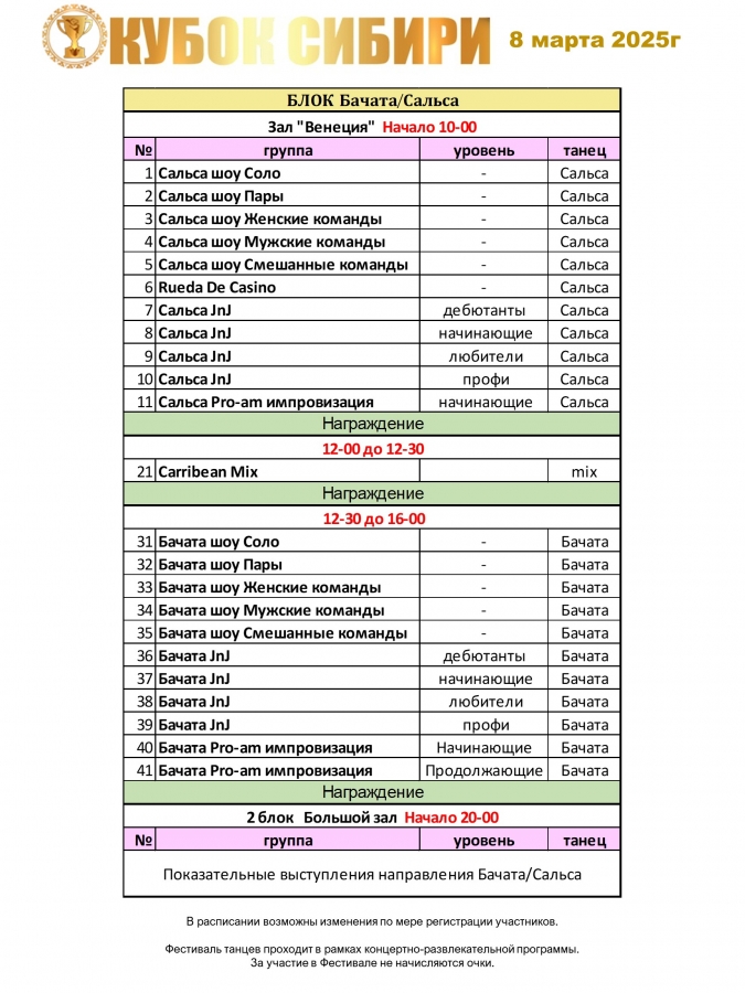 Расписание «Фестиваль танца "Кубок Сибири". Salsa/Bachata»
